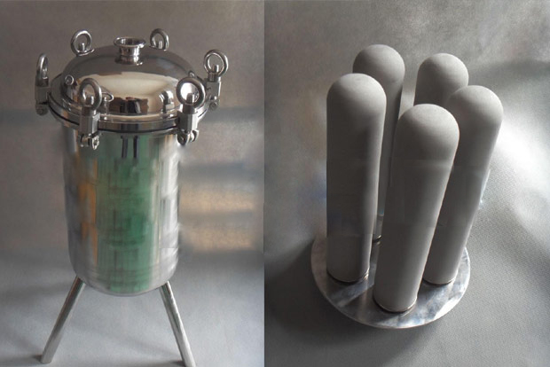 一、鈦棒過濾器產品介紹: 鈦棒過濾器使用的是鈦粉末燒結濾芯,一般用于粗濾和中間過濾。此濾芯具有精度高,耐高溫,耐腐蝕,機械強度高等優(yōu)點,在醫(yī)藥行業(yè)廣泛應用,外殼材料為316L或304不銹鋼。符合GMP標準。 二、鈦棒過濾器用途: 本過濾器采用不銹鋼材料做外殼,內部濾芯為鈦管,具有耐高溫、高壓、強酸、強堿、耐腐蝕,濾芯可反復再生使用等特點,是采用粉末冶金方法將金屬粉末通過高溫燒結的方法加工制成的空心濾管。此系列產品具有結構緊湊造型美觀按GMP標準生產,管件連接采用國際標準快裝式連接,拆裝清洗方便。 三、鈦棒過濾器使用注意事項: 1、避免劃傷碰撞,灰塵及油污。 2、在使用中其工作壓力不應超過額定工作壓力。 3、本產品工作運行到一定周期后,可能由于過濾元件堵塞,至使壓力升高流量降低,需要反沖或反洗再生。再生周期視額定的壓力和流量而定。 四、鈦棒過濾器清洗方法: 鈦棒濾芯在使用一段時間以后,將產生一定程度的堵塞,表現流量減少,過濾前端壓力增高,如:從0.22pa以下升高到0.3mpa以上,這時就要對濾芯進行清洗,清洗方法一般有以下幾種: 1、對于新使用的濾芯,一般采用清水反洗,氣體反吹的方法來進行清洗,即用稍大于工作壓力(如0.3mpa)的清水反方向注水清洗。反沖時間約為1-3分鐘即可。 2、對于多次反沖洗后過濾效果不明顯回升的時候,可用5%以下的鹽酸溶液,或8%以下的硫酸溶液,或10%以下的NaoH溶液在常溫下浸泡,再用清水洗凈。 具體選用酸洗或堿洗,應視過濾液中雜質容易溶于酸或緘來選擇。