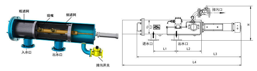 型號 管徑 出入水口 L1 L2 L3 L4 H d 濾網(wǎng)面積 處理水量 重量